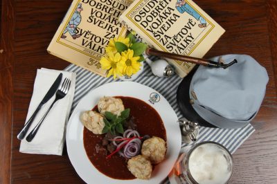 The atmosphere of the restaurant is enhanced by traditional Czech folk music and period clothing of the waiting staff. Bar staff wear a “Svejk’s cap”, a white shirt, gray trousers and braces. Female staff wear a red skirt and a white blouse. One of the main attributes of the restaurant are a very stylish interior with original period elements.